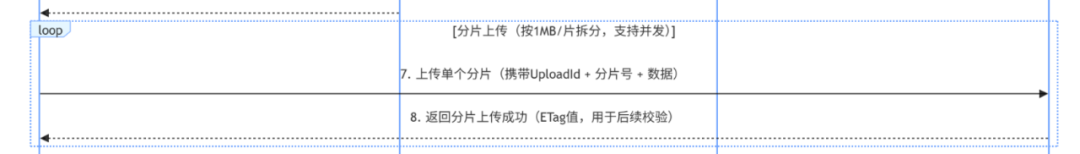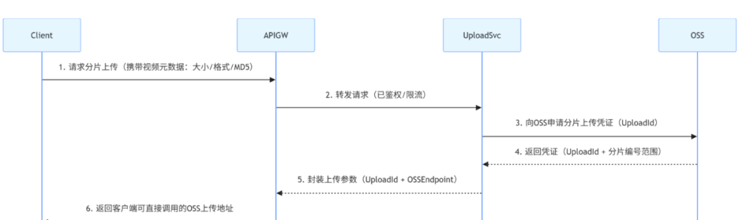 1. 客户端发起上传请求,获取分片上传凭证(对应时序图 1-6 步)