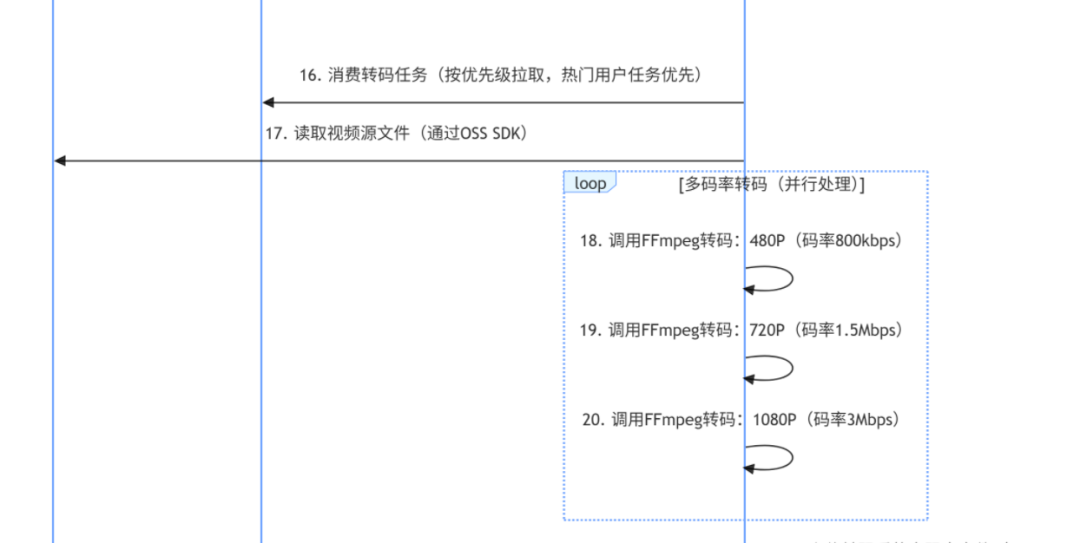 4. 转码服务消费任务,处理多码率转码(对应时序图 16-20 步)