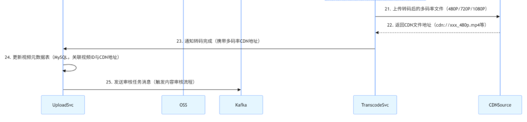 5. 转码完成,写入 CDN 源站,更新元数据(对应时序图 21-25 步)