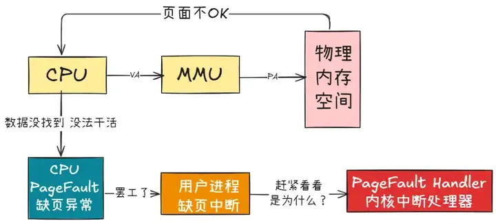 CPU将虚拟地址发送给MMU。MMU根据虚拟地址中的页号找到对应的页表项。如果页表项中标记为有效,则获取对应的物理页框号。将物理页框号与虚拟地址中的偏移量组合,得到最终的物理地址。将最终物理地址返回给CPU,程序可以访问该物理地址上存储的数据。如果在步骤3中发现页表项无效,则表示所请求的页面不在物理内存中。这时可能触发缺页异常,操作系统需要从磁盘上加载对应页面,并更新页表项以建立新的映射关系。