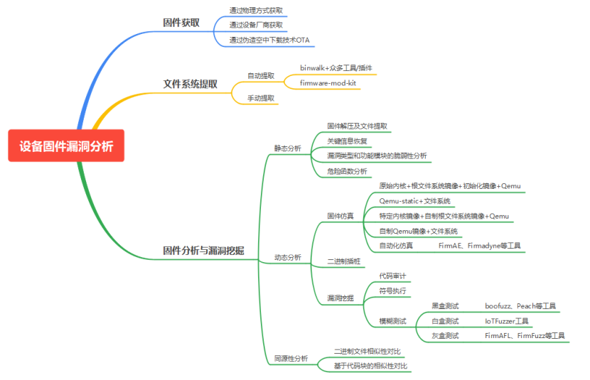 目前设备固件漏洞分析流程包括固件获取、文件系统获取和漏洞挖掘等三部分,具体流程如图2所示。