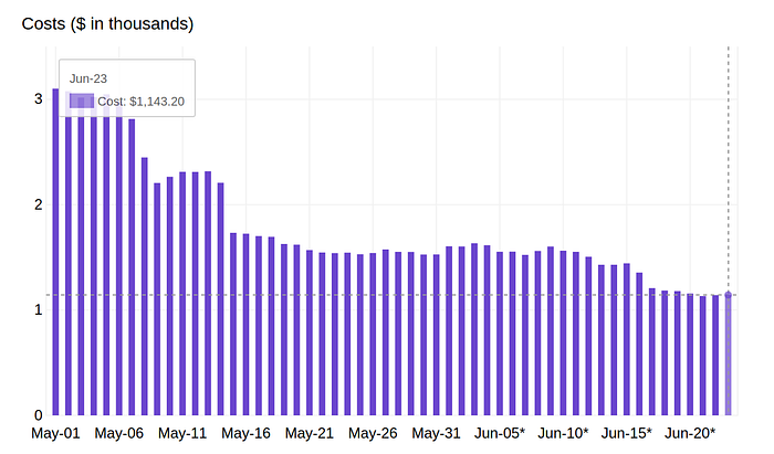 在这个阶段的最后几周,我们取得了最大的进展,特别是在 6 月 24 日左右。经过最后四周的努力,我们成功将大部分缓存负载从 AWS S3 转移到了自有的 Cassandra 集群。此时,AWS 的每日费用已经降至 1,100 美元,每月预算为 35,000 美元,而新服务器的每月经常性成本预计在 14,000 美元左右。