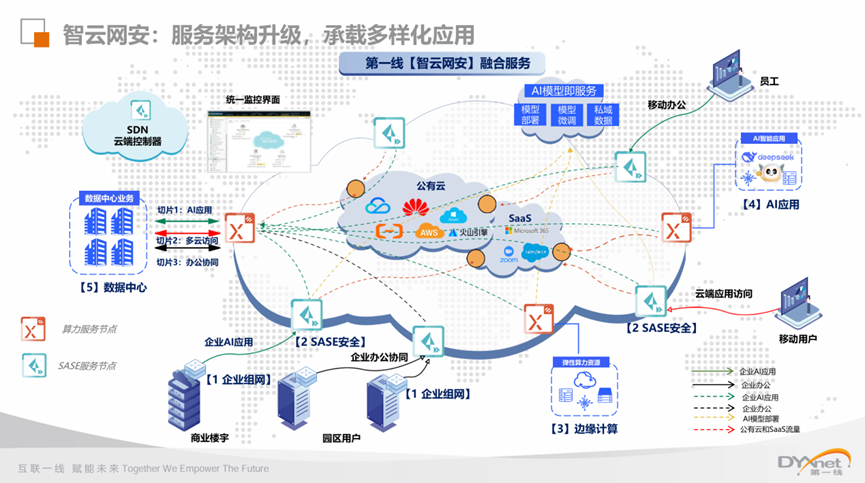 在网络层面,传统公网环境下大模型参数传输常常面临丢包、延迟、数据安全等一系列问题,已经很难满足企业部署大模型应用的需求。为此,第一线通过升级企业互联能力、AIDC互联能力和云连接能力,打造了贯穿企业私域空间、不同域、不同主体的AI Cross-Connection能力,满足了企业访问私域AI应用场景、分布式算力协同场景、多云互联协同场景的需求,帮助企业构建了从不同云平台到企业不同私域应用的高速安全连接。