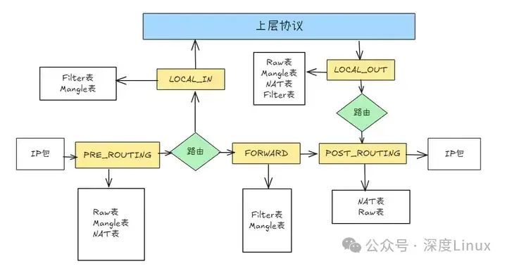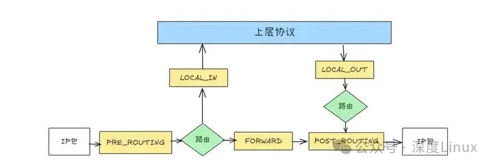 PRE_ROUTING:IP包进入IP层后,还没有对数据包进行路由判定前;LOCAL_IN:进入主机,对IP包进行路由判定后,如果IP 包是发送给本地的,在进入传输层之前对IP包进行过滤;LOCAL_OUT:IP包通过传输层进入用户空间,交给用户进程处理。而处理完成后,用户进程会通过本机发出返回的 IP 包,在没有对输出的IP包进行路由判定前进行过滤;FORWARD:IP包进行路由判定后,如果IP包不是发送给本地的,在转发IP包出去前进行过滤;POST_ROUTING:对于输出的IP包,在对IP包进行路由判定后进行过滤;