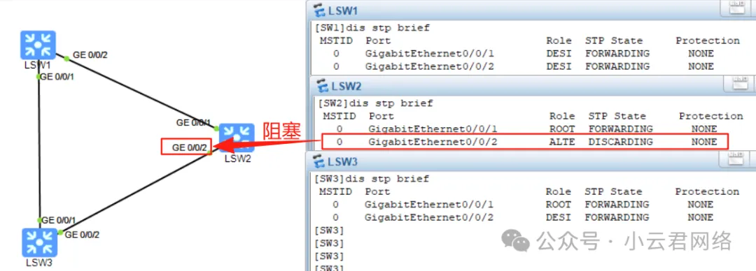 三台支持生成树的交换机组网,并启用RSTP。本地测试,SW2的GE0/0/2接口在成环时是能正常阻塞破环的。