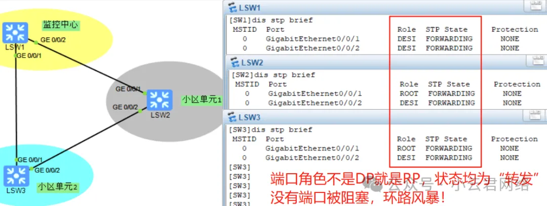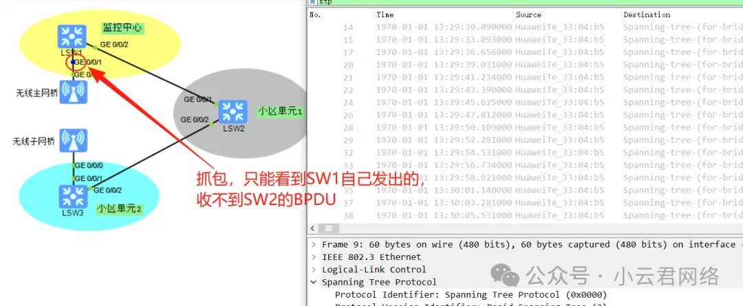 这里问题就比较明确了:因为监控中心和小区单元2之间非直连,收不到彼此的BPDU。所以在生成树看来,整个拓扑不存在环路,因此收敛失败。这里就有很多朋友会犯得一个错误,以为“无线网桥链路相当于一条网线”,这是错误的!很多网桥协议报文无线链路是不会转发的,而BPDU报文就是其中的而一种。
