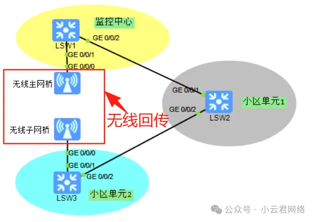 经过了解发现,用户本地测试是直连测试,所以交换机之间的生成树收敛正常。而项目现场中,发现小区单元2的交换机是通过无线网桥回传给监控中心的: