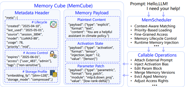 该系统的MemScheduler组件动态管理不同类型的记忆:从临时激活状态到永久参数修改,并根据使用模式和任务要求选择最佳存储和检索策略。这与当前方法大相径庭,当前方法通常将记忆视为完全静态(嵌入在模型参数中)或完全短暂(仅限于对话上下文)。