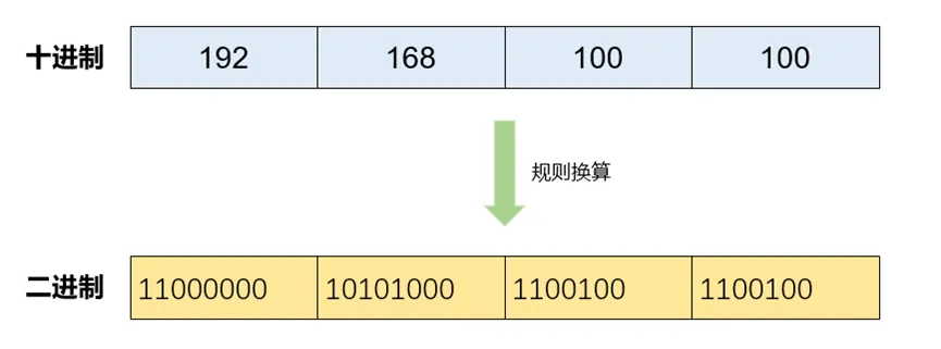 十进制:192.168.100.100对应二进制:11000000.10101000.01100100.01100100