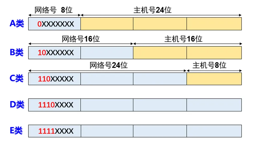 为适配不同规模的网络,IPv4地址被划分为5类,其中A、B、C类为常用类型,D、E类用于特殊场景。分类的核心区别在于网络号与主机号的位数分配。