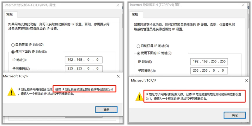 提示:在Windows系统中,配置此类地址会提示“IP与子网掩码组合无效”。