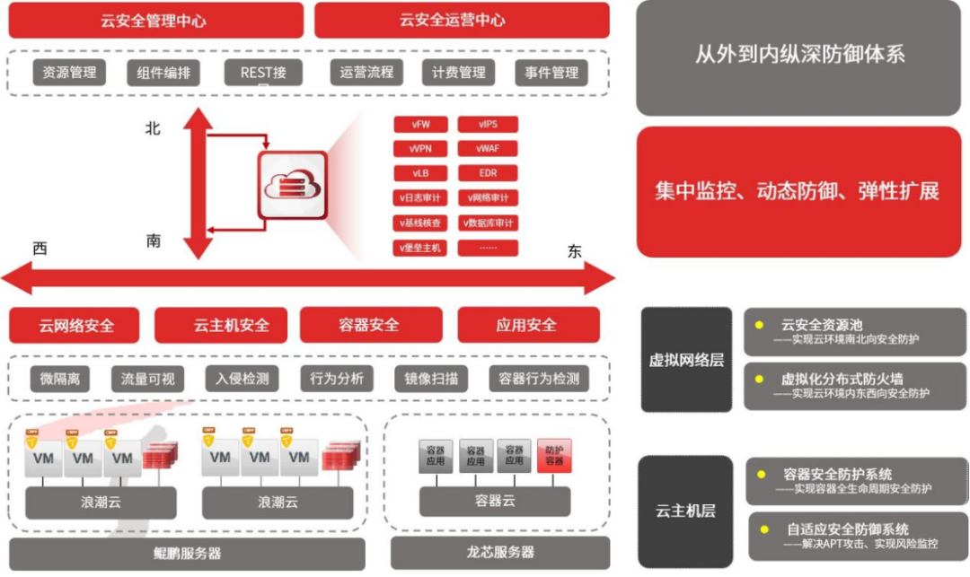针对客户的国产化适配、安全合规及政务云安全体系建设等核心需求,天融信依托云安全资源池、虚拟化分布式防火墙、容器安全和云安全运营平台产品,帮助客户构建起从外到内多层次的纵深主动安全防御体系,实现集中监控、动态防御、弹性扩展,全面守护政务云内业务系统安全。具体方案如下: