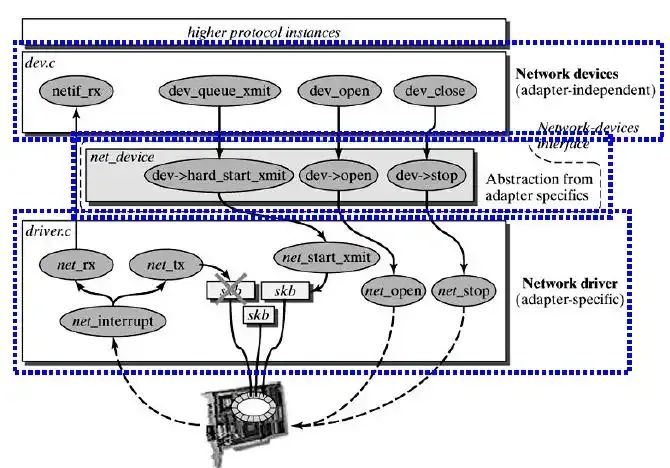 实现上,Linux 提供了一个 Network device 的抽象层,其实现在 linux/net/core/dev.c。具体的物理网络设备在设备驱动中(driver.c)需要实现其中的虚函数。Network Device 抽象层调用具体网络设备的函数。