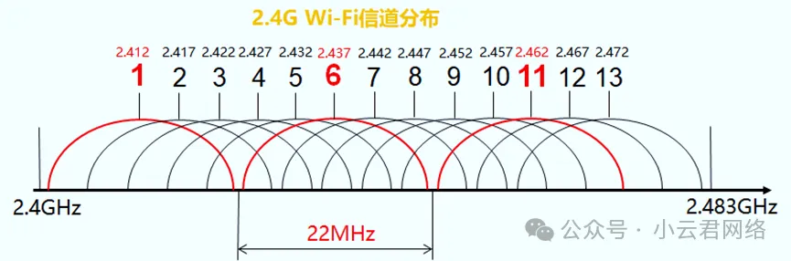 2.4GHz频段:在2.4GHz-2.483GHz范围内,划分了13个信道,每个信道带宽22MHz;
