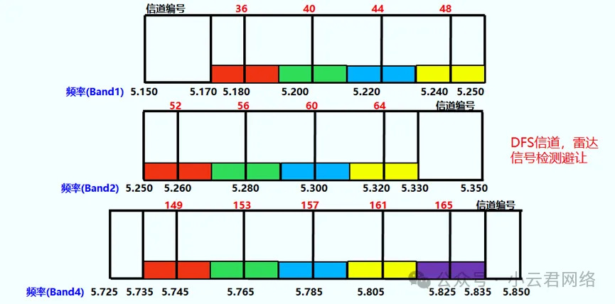 5GHz频段:国内使用5.150GHz-5.250GHz、5.250GHz-5.350GHz和5.725GHz-5.850GHz三个频段,共13个信道。