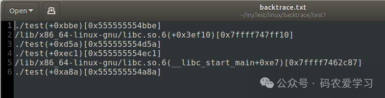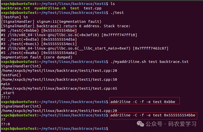 main函数,test.cpp的65行:调用的TestFun函数TestFun函数,test.cpp的50行:执行的printf("[%s] a[1]=%d\n", __func__, a[1]);SignalHandler函数,test.cpp的20行:崩溃触发的SIGSEGV信号被捕获后,在SignalHandler函数中的backtrace被处理SignalHandler函数中,通过backtrace_symbols打印的信息,与通过backtrace_symbols_fd保存在backtrace.txt文件中的信息,其实是一样的: