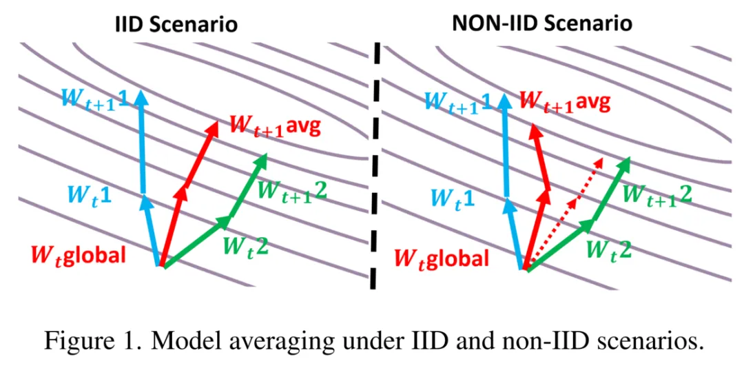 如下图 1 所示,在 IID 场景下,全局最优解与本地最优解相对一致,而在非 IID 场景下,全局最优解可能与单个本地最优解相距较远,这一现象被称为客户端漂移(client-drift),从而导致 FL 训练过程中的收敛变慢且不稳定。