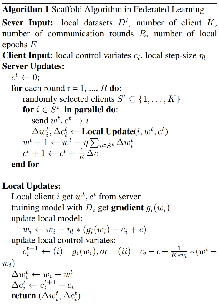 为应对这一挑战,Scaffold 作为一种稳健的联邦学习(FL)方法被提出,旨在通过基于控制变元(control variates)的校正机制来减缓客户端更新的偏移,从而提升在非 IID 场景下的模型收敛性。控制变元本质上是对客户端本地梯度与全局梯度之间差异的估计,它有助于将本地更新方向与全局优化目标对齐。Scaffold 能够减少由于数据异质性引起的更新方差,使其在客户端拥有多样化数据分布的场景中表现尤为出色。