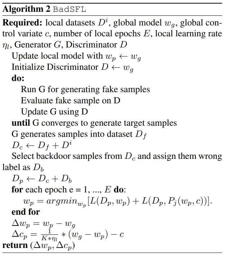 知识有限。 在非 IID 场景中,攻击者对各客户端数据分布缺乏了解,这是主要挑战之一。与 IID 场景不同,在 IID 中对数据集有集中化的认知,有利于攻击者操控;而非 IID 场景涉及分散且多样化的数据分布。这会导致以下三个问题:直接的后门策略可能会导致良性样本上的性能大幅下降,从而使全局模型被拒绝;数据分布的差异性加剧了本地模型与全局模型之间的差距,使得恶意模型更容易被检测到;将中毒模型与全局模型平均聚合会降低其在主要任务上的性能。控制变元。 在 SFL 中,控制变元(记为 c_i)用于纠正客户端漂移,使本地模型与全局模型对齐。如果攻击者严格遵守协议,在植入触发器的过程中使用 c_i 对恶意模型进行校正,攻击效果可能会减弱。相反,如果攻击者选择不当篡改 c_i 并将恶意的 c 上传至服务器,则可能导致全局模型被破坏。后门灾难性遗忘。 灾难性遗忘是指神经网络在学习新任务时忘记先前已学任务的现象。这会导致后门功能随着时间推移而失效。如果攻击者停止上传恶意更新,后门功能最终可能会被良性更新抹去BadSFL 算法详解