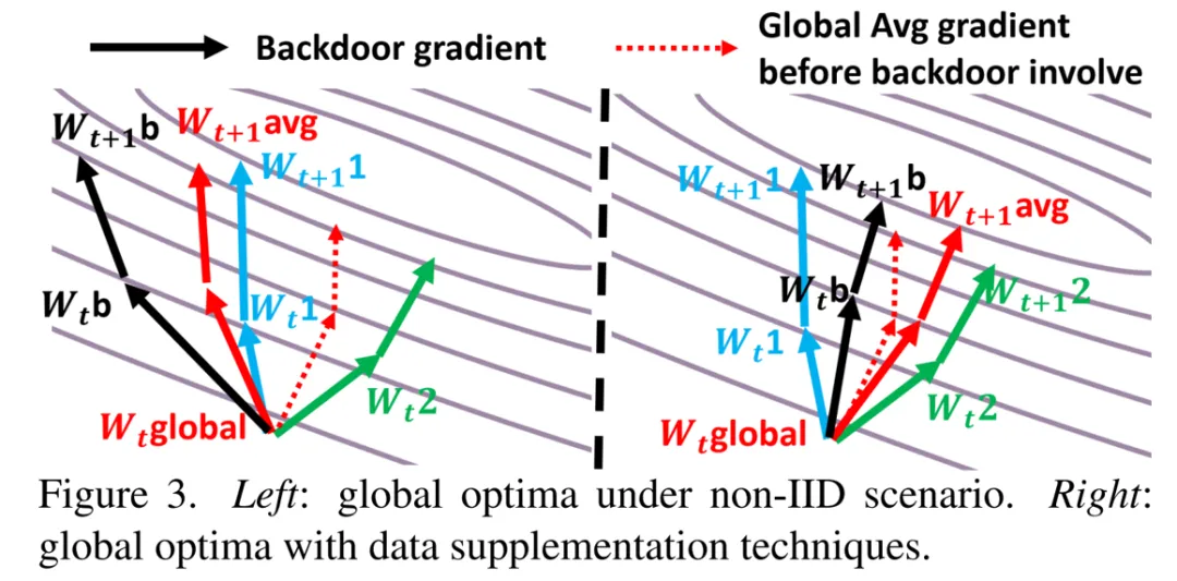 攻击者在每一轮本地训练中,会利用从服务器下载的最新全局模型  同步更新判别器 D,随后执行 GAN 训练以优化生成器 G 的性能。该过程的输出结果会被合并到攻击者的非 IID 数据集中,用于进一步的后门训练。由于生成的样本与其他客户端数据集的样本高度相似,攻击者训练得到的本地最优解能够比其他客户端的本地最优解更接近全局最优解。下图 3 展示了在有与无数据补充技术的情况下,聚合后的全局最优解之间的差异。