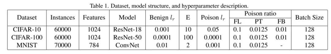 本文在 MNIST、CIFAR-10 以及 CIFAR-100 三个数据集上对 BadSFL 的有效性进行了实验评估。实验比较了 4 个其它的已知后门攻击,包括Block-box Attack、Neurotoxin、Irreversible Backdoor Attach (IBA) 和 3DFed。下表 1 总结了细节的实验设置。