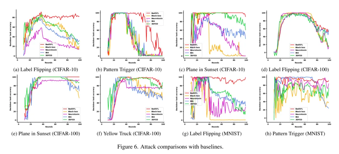 从图 6a 到图 6f,我们展示了在 CIFAR-10 和 CIFAR-100 数据集上与基准方法的攻击对比。可以明显看出,BadSFL 在攻击有效性和持久性方面都优于基准攻击方法。