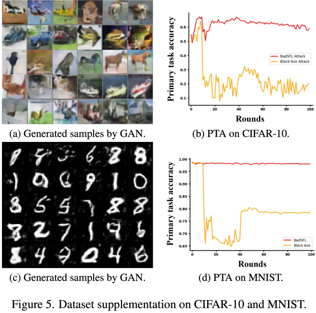 另外,BadSFL 利用一个经过生成对抗网络(GAN)增强的数据投毒策略,丰富了攻击者的数据集,在保持对正常样本和后门样本都具有高精度识别能力的同时,保持隐蔽性。