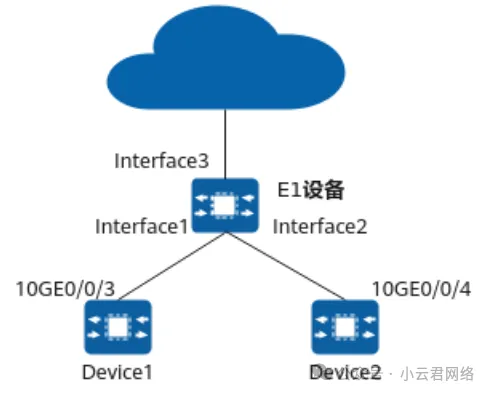 E1设备分别与华为Device1的10GE0/0/3接口、Device2的10GE0/0/4接口相连,同时E1设备还有一个上行接入口Interface3连接其他网络设备。