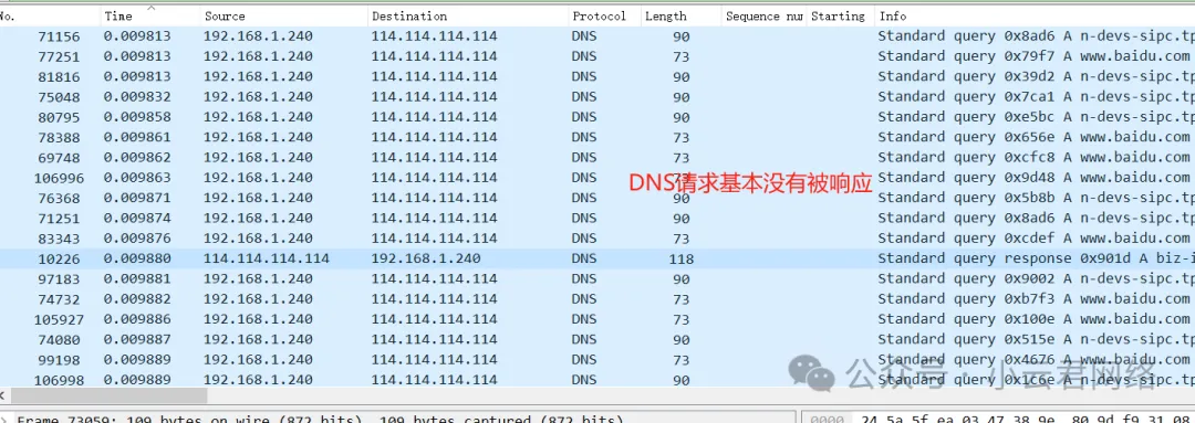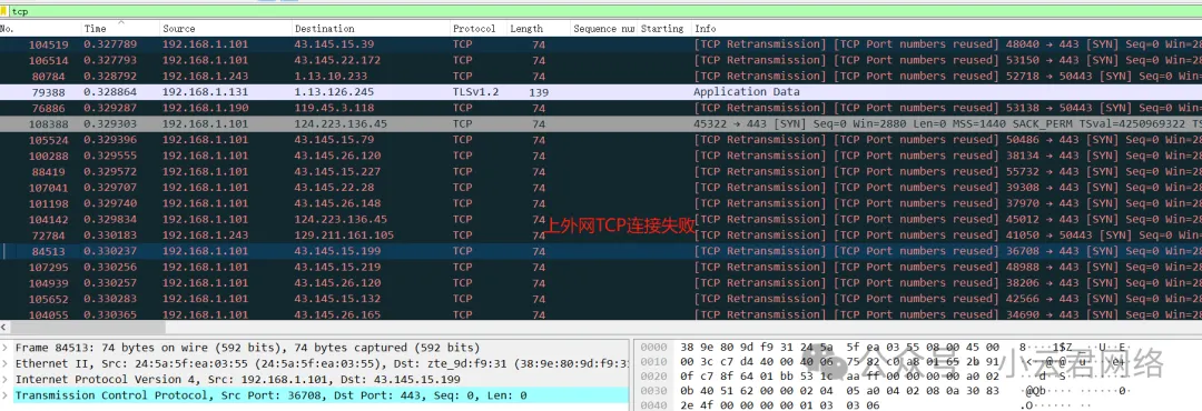 这里直接分析原因吧,异常的时候确实终端DNS请求没响应,终端TCP向公网发起连接也是不成功的: