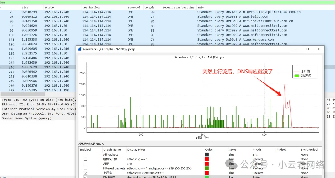 光猫出口突然上行流后(单位换算为16Mbps),前端的DNS响应基本就没有了。所以能大胆的猜到,前端监控到上行流突发异常后,运营商便将链路封掉了,也就是封杀PCDN的手段。然后我们进一步明确:这些突发上行流是门店新增的IPC定期向云端上传存储视频出现的,是符合预期的行为。4. 原理及解决方案与运营商沟通解决;