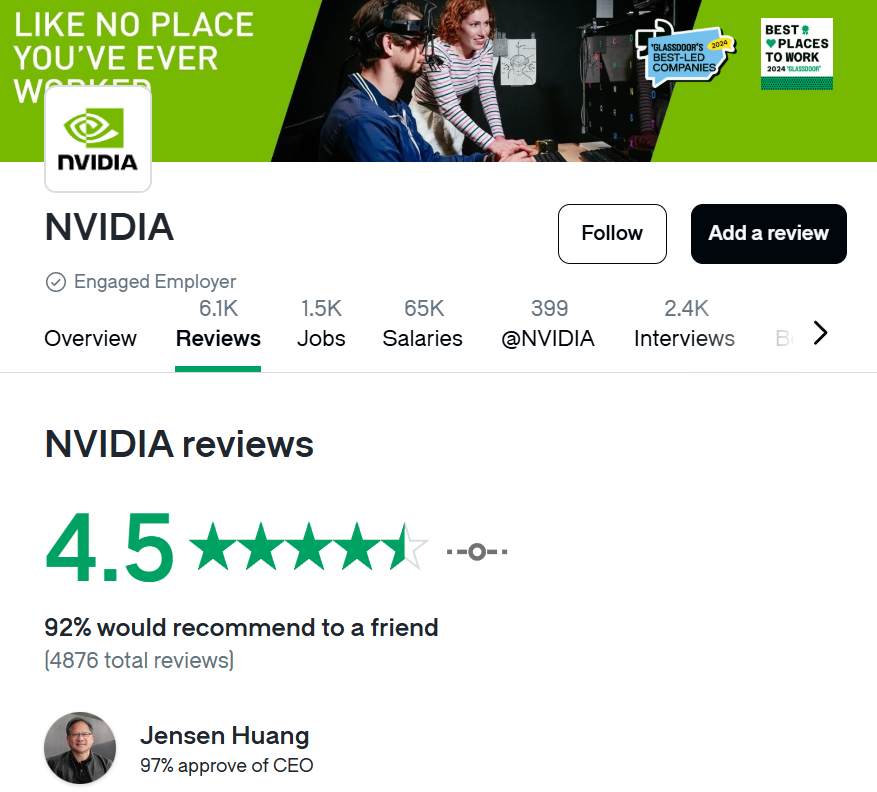 更是有 97% 的员工认可了黄仁勋的领导!