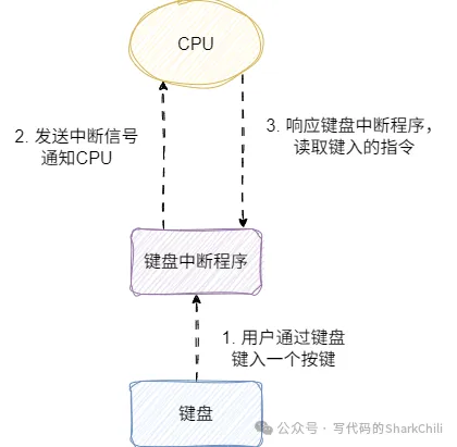 以用户键盘打字输入为例,从键盘输入到CPU处理的流程为: