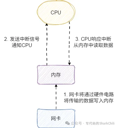 网卡收到网线传输的网络数据通过硬件电路完成数据传输将数据写入到内存中的某个地址中网卡发送一个中断信号给CPUCPU响应网卡中断程序,从内存中读取数据了解网络数据包获取流程整个流程后,不知道读者是否发现,网卡读取数据期间CPU似乎无需参与工作的,那么操作系统是如何处理这期间的任务调度呢?