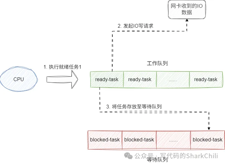 这也就是IO阻塞避免CPU资源消耗的原因,即在IO阻塞态时,CPU会将这些任务挂起切换执行其它任务,等其IO数据准备就绪并发起中断信号时,再回头处理这些任务。