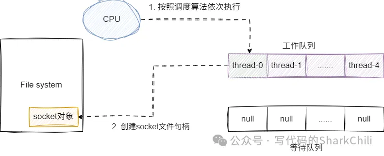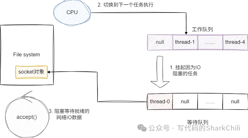 (2) serverSocket.accept();阻塞监听等待客户端连接,此时CPU就会将其放到等待队列中,去处理其他线程任务。