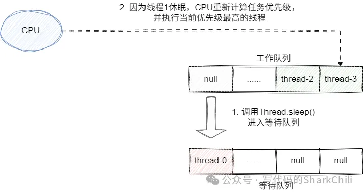 1. Thread.sleep()如何优化抢占式调度的饥饿问题上文提到抢占式算法可能导致线程饥饿的问题,所以我们是否有什么办法让长时间霸占CPU的线程主动让CPU重新计算一次优先级呢? 答案就是Thread.sleep()方法,通过该方法就相当于对当前线程任务的一次洗牌,它会让当前线程休眠进入等待队列,此时CPU就会重新计算任务优先级。这样一来那些因为长时间等待使得优先级被拔高的线程就会被CPU优先处理了: