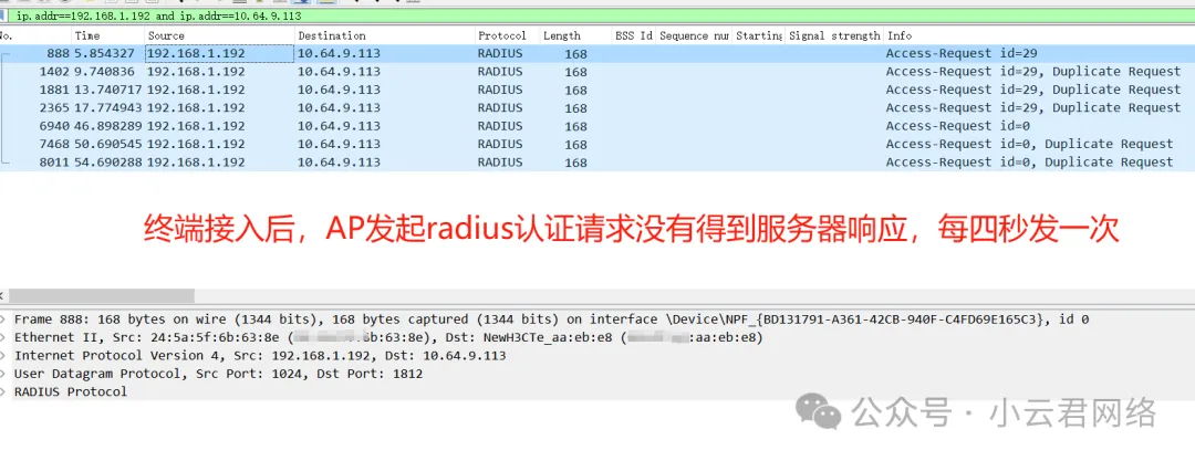 发现异常新增AP是有将RADIUS报文发出去的,但是没有得到服务器响应。