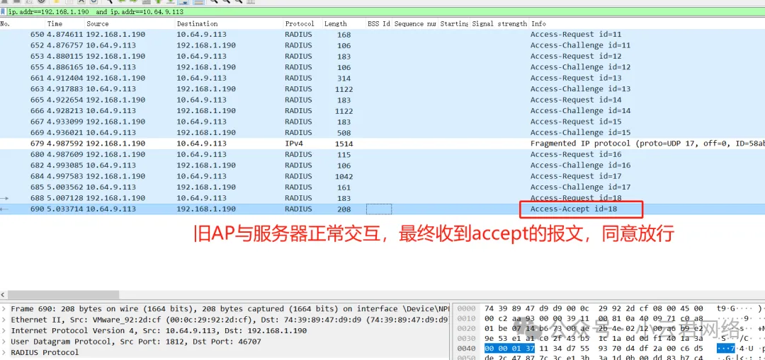 而正常的旧AP能与服务器正常交互,并最最终收到服务器accept的放行指示。