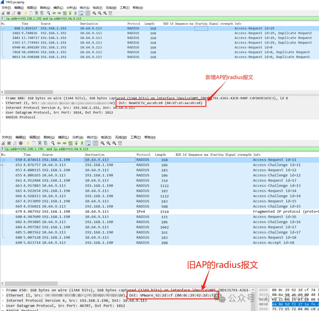 第三步、确认正常和异常无线AP与radius服务器的交互