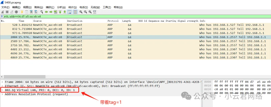 因为是跨三层访问,目的MAC则是核心交换机192.168.1.1接口的MAC,然而新增AP学得是错误的04:d7:a5:aa:eb:e8,说明AP有线侧过来的ARP还有其它设备声明自己是192.168.1.1,即IP冲突!过滤ARP和对应MAC,果然发现有设备ARP: