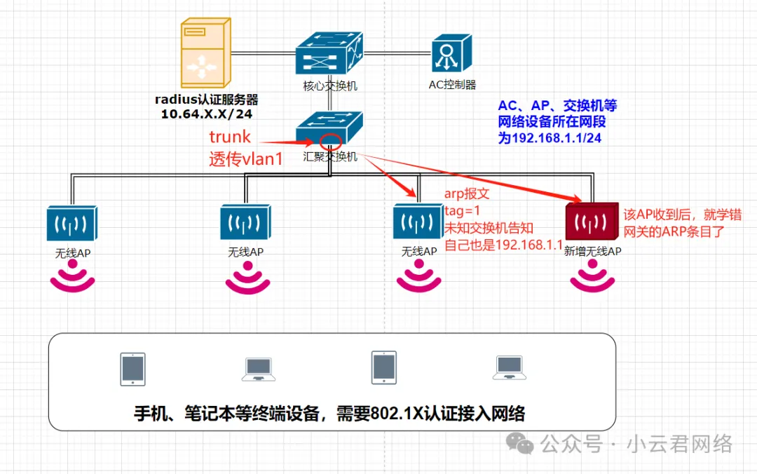 问题总结:AP上联交换机将ARP tag=1的报文透传给了AP,其中有设备的IP与核心的IP冲突都是192.168.1.1。新型号AP的存在未知BUG,自身未配置透传VLAN1的情况下收到了ARP tag=1的报文,也把它学到自己的表项里面去了,因此发radius报文跨三层给服务器时,目的MAC封错。