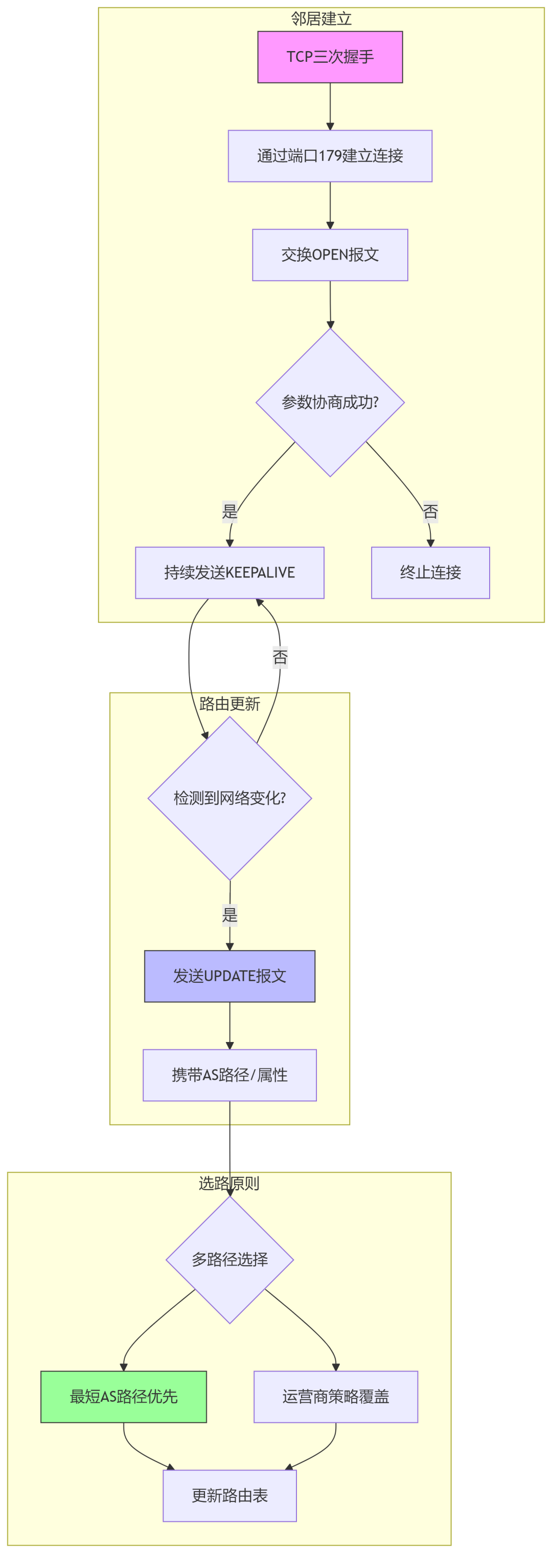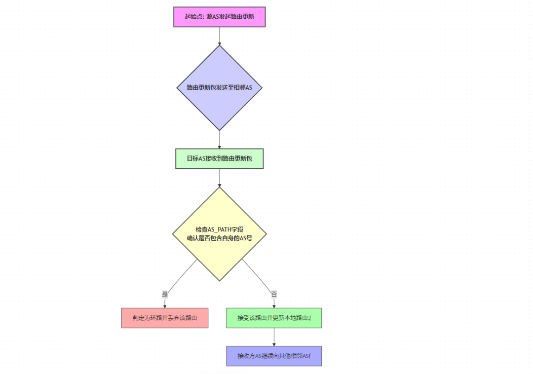 防环路机制:通过AS路径检测重复AS号,自动丢弃环路路由。