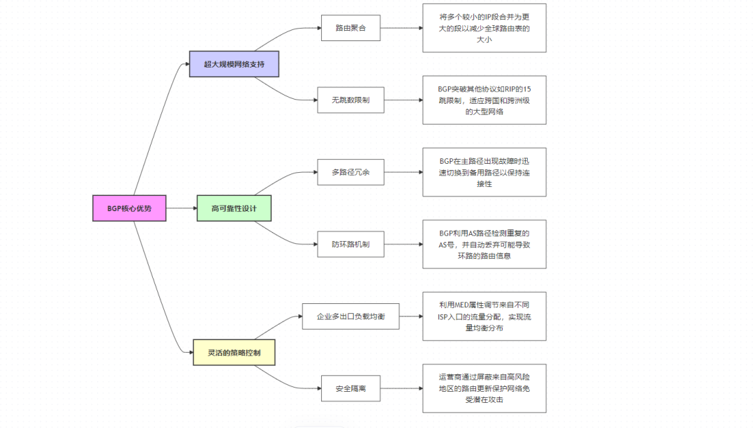 路径控制灵活:通过AS路径、优先级等属性选择最佳路线,避免拥堵和环路。