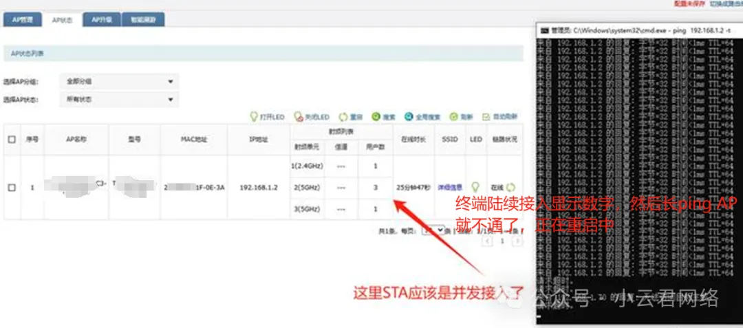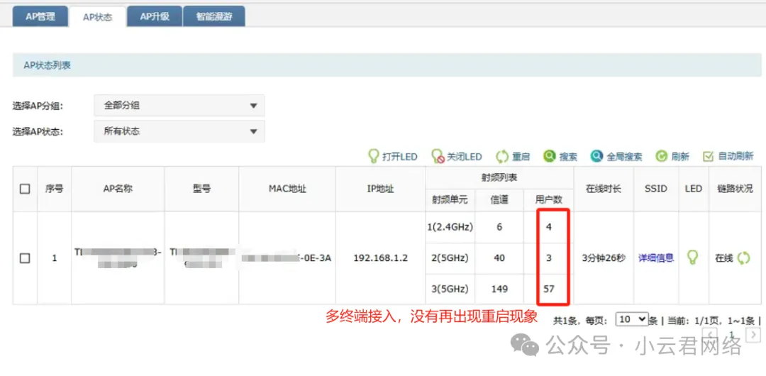 从现象来看:并发多个终端接入AP点才会导致重启,说明大概率是高并发接入时供电功率不足导致的重启,所以需要对比确认现场DC供电的电源和AP功耗规格。