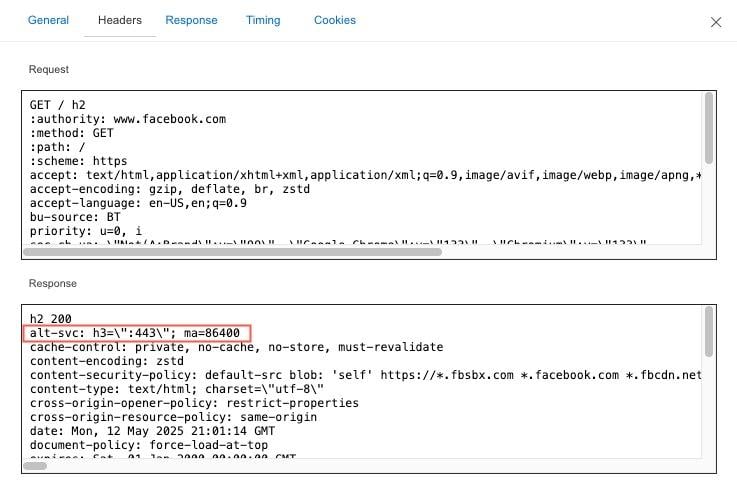 浏览器在ma(max-age)参数所定义的持续时间内对其缓存。在后续访问时,浏览器直接尝试HTTP/3,而无需先通过HTTP/2进行协商。一旦Alt-Svc被缓存: