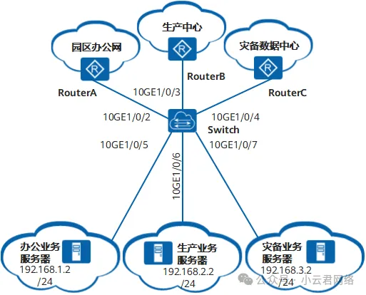 如图1所示,Switch连接有办公业务服务器、生产业务服务器、灾备业务服务器,不同业务的IP地址网段各不相同。现需要将不同类型的业务划分到不同的VLAN中,通过不同的VLAN ID分流到不同的远端网络上以实现业务互通。