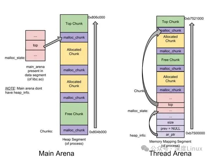 子 Arena 的堆则是通过mmap系统调用创建的,与主 Arena 的堆不同,子 Arena 的堆可以有多个,并且这些堆之间通过链表进行连接。这就像是多个分散的小型仓库,每个仓库都有自己独立的管理方式。子 Arena 的堆通常用于满足一些特殊的内存分配需求,或者在多线程环境下,为不同的线程提供独立的内存分配空间,以减少线程之间的内存竞争。当一个子 Arena 的堆空间用尽时,会申请新的堆,并将其加入到链表中,就像小型仓库物资不足时,会新建仓库并与原有仓库连接起来。