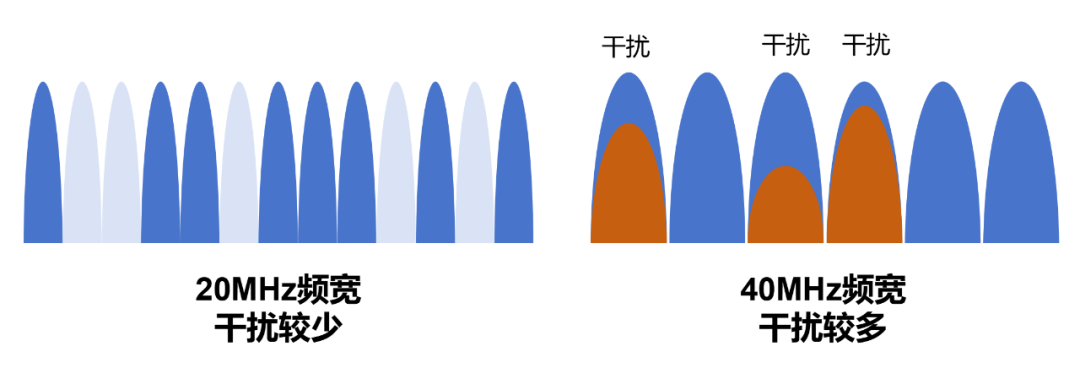 如果将频宽设置为40MHz,虽然单用户的理论速率得以提升,但可用信道数变少了,频谱干扰变严重了。