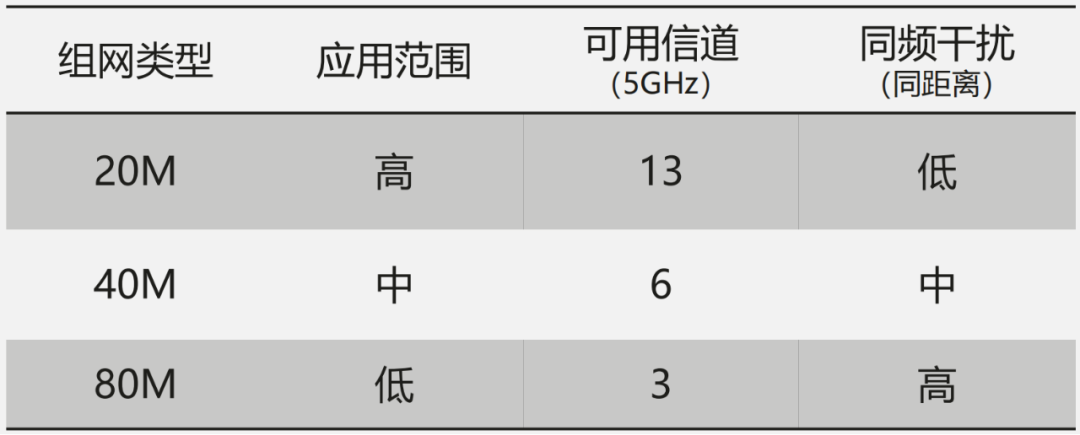 对大多数国家或者区域来说,如果采用40MHz频宽,就只有6个可用信道。根据测试,在40MHz组网下,受同频干扰的影响,整网性能会下降30%。