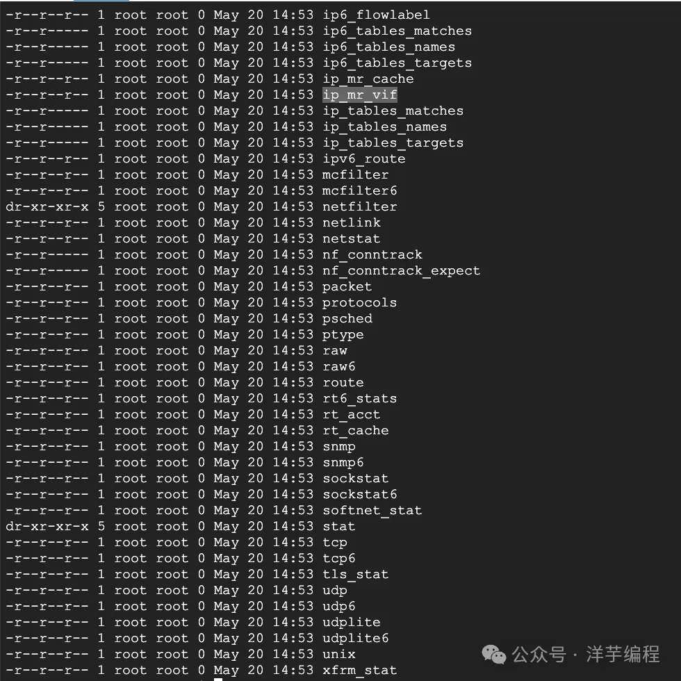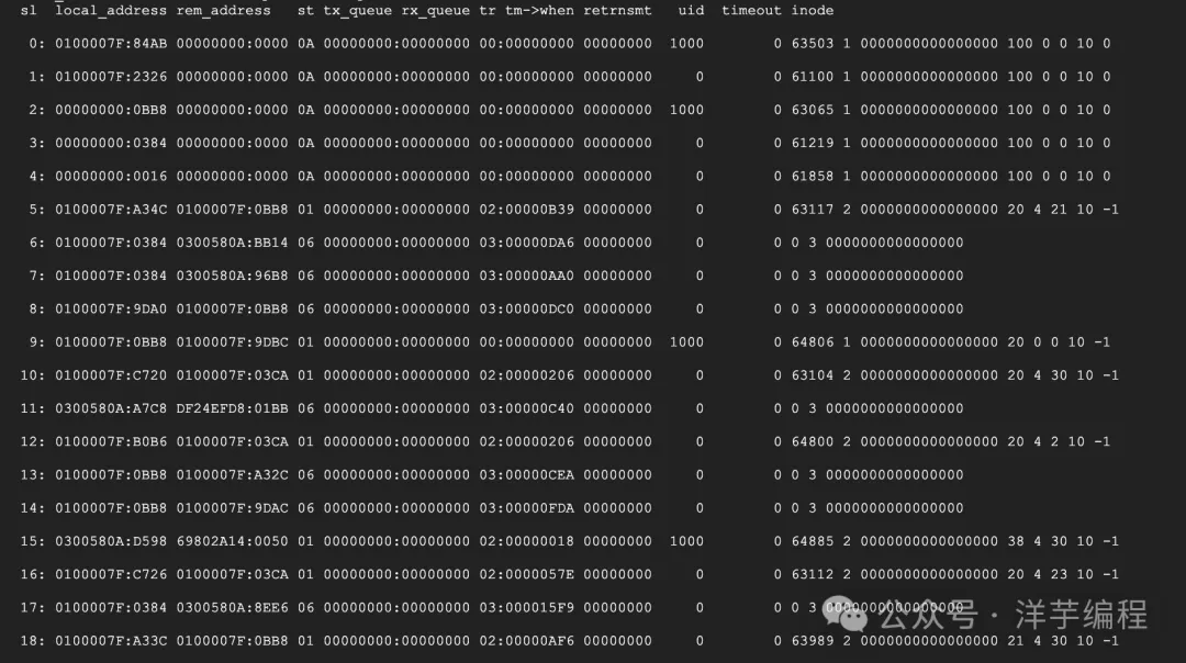 进程网络相关的文件都在 /proc/{pid}/net 目录下面,可以根据不同的协议类型查看对应的文件,输出结果和 /proc/net/ 下面的文件基本类似,限于篇幅,这里就不再赘述了。